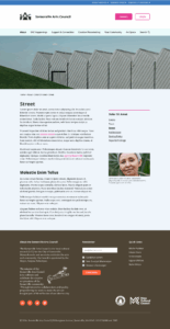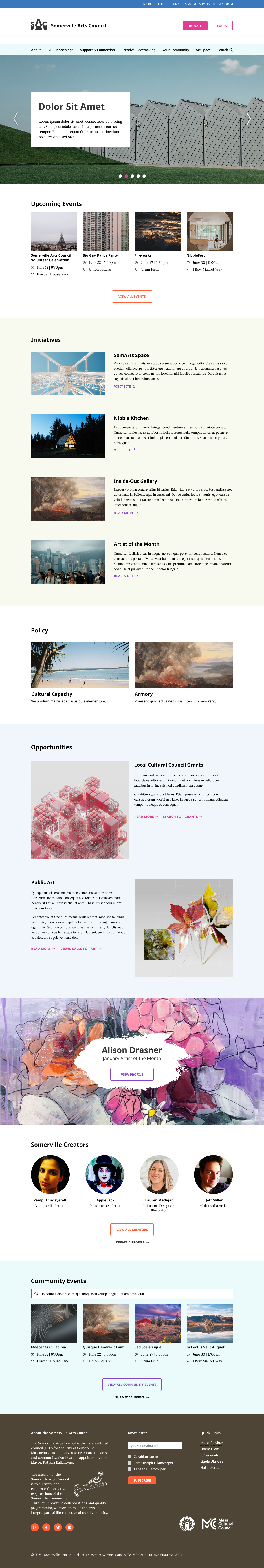 The homepage. The top spotlight area dynamically displays events from the events calendar, arbitrary pages that have been promoted to the homepage, and spotlight content blocks. Other parts of the homepage dynamically display content, such as the events section and artists of the month.