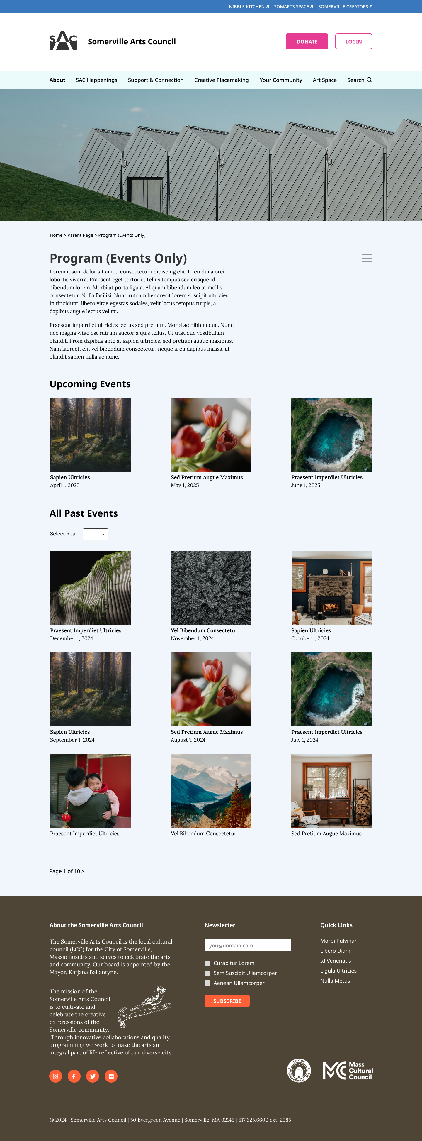 The program index template (desktop). Many of the programs have past events associated with them. The old site required creating a new page for every year of events; the new system collapses them into an easily browsable format via a pull-down menu.